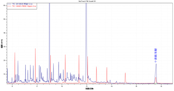 樣品TIC圖(藍(lán)色)與多溴聯(lián)苯醚混標(biāo)TIC圖(紅色)