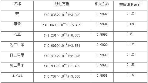 7種苯系物在進(jìn)樣量1-320ng范圍內(nèi)線性相關(guān)系數(shù)為0.9981-0.9999,線性關(guān)系良好。以響應(yīng)信號(hào)為基線噪聲10倍時(shí)對(duì)應(yīng)的進(jìn)樣濃度作為定量限,確定物質(zhì)的定量限均小于0.21μg/m3。
