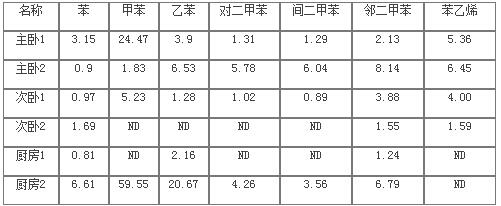 在剛裝修完的兩套住宅的三處不同地點(diǎn)進(jìn)行取樣并分析7種苯系物的含量,測(cè)試結(jié)果見表7。