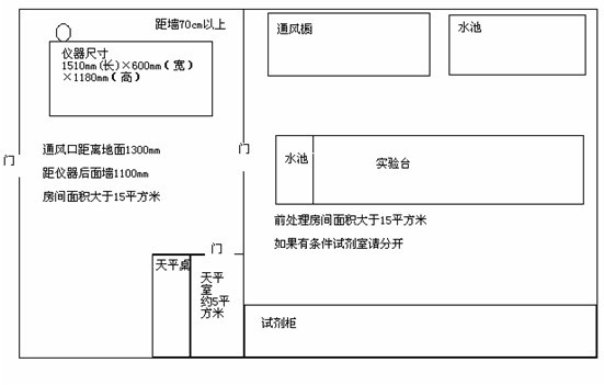 ICP-2000型ICP掃描光譜儀的外形尺寸為1510mm(長)×600mm(寬)×1180mm(高),重量為300kg ,發(fā)貨時(shí)四角裝有減震器,儀器運(yùn)到用戶后卸下減震器,換上螺絲桿,當(dāng)儀器選好位置后,將螺絲桿旋出使四角輪懸空,調(diào)節(jié)螺絲桿使儀器至水平,為保持儀器性能穩(wěn)定及便于維護(hù),ICP-2000 周圍必須留出供維護(hù)人員維護(hù)儀器所需的空間(安裝臺(tái)距后面墻面至少70cm)