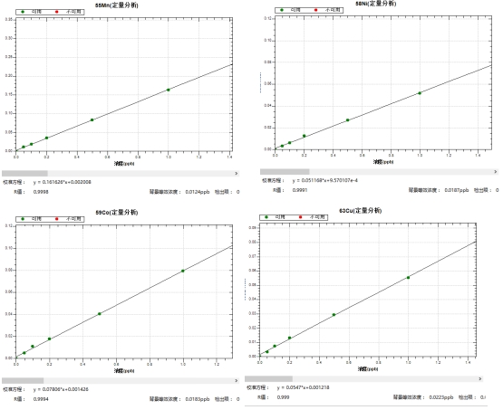 冷焰模式下,繪制各元素0,0.05,0.1,0.2,0.5,1.0μg/L系列濃度標(biāo)液工作曲線,39K、40Ca、56Fe等同位素的線性相關(guān)系數(shù)r均大于0.999,背景等效濃度為0.0023μg/L~0.0217μg/L。