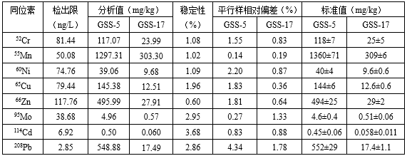 采用ICP-MS2000E電感耦合等離子體質(zhì)譜儀測(cè)定土壤標(biāo)準(zhǔn)物質(zhì)中Cr、Mn、Ni、Cu、Zn、Mo、Cd、Pb八種金屬元素含量,檢出限在2.85-117.76 ng/L之間,穩(wěn)定性在0.60%-3.68% 之間,各元素測(cè)試結(jié)果與標(biāo)準(zhǔn)值相符,能夠滿足第三次全國(guó)土壤普查中關(guān)于電感耦合等離子體質(zhì)譜法檢測(cè)上述各元素的要求。