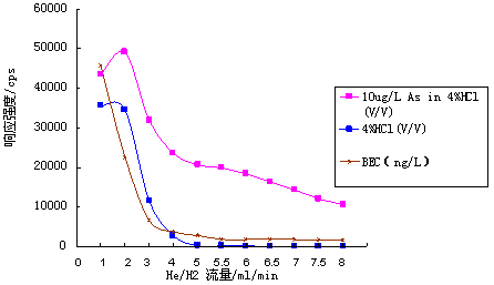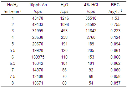 儀器首先在標(biāo)準(zhǔn)模式下進(jìn)行參數(shù)優(yōu)化(利用10μg·L-1的Li、Co、In、U、Ce調(diào)諧液對儀器工作參數(shù)進(jìn)行調(diào)節(jié),使儀器靈敏度高,同時(shí)氧化物及雙電荷產(chǎn)率小于3%);再開啟He/H2碰撞反應(yīng)氣,逐步增大He/H2流量,測試超純水、4%HCl及10μg·L-1 As(4%HCl介質(zhì))在75amu處的響應(yīng)信號(hào),計(jì)算其背景等效濃度(詳細(xì)數(shù)據(jù)見表1及圖1);并利用As標(biāo)液進(jìn)一步優(yōu)化He/H2流量,得到儀器工作參數(shù)如表2所示。