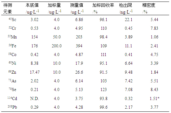 在儀器優(yōu)化工作參數(shù)條件下,對樣品溶液及加標(biāo)樣液進(jìn)行測試,計(jì)算其加標(biāo)回收率;對樣品空白溶液平行測定7次,以三倍空白信號(hào)標(biāo)準(zhǔn)偏差/靈敏度對應(yīng)的濃度為檢出限;同時(shí)對樣品溶液平行測定11次(間隔2min),計(jì)算其相對標(biāo)準(zhǔn)偏差,考察精密度,數(shù)據(jù)見表4。各元素檢出限在0.41-22.07ng/L之間,加標(biāo)回收率在93.82%-123.10%之間,精密度在1.06%-8.43%之間。