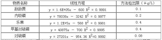 結(jié)果表明6種有機(jī)磷線性關(guān)系良好,檢測(cè)限為0.08~0.4μg/L,能滿足國標(biāo)GB 3838-2002中對(duì)六種有機(jī)磷的限量要求。