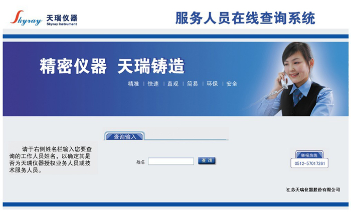 經(jīng)過2個月的準備工作,天瑞儀器“服務(wù)人員在線查詢”系統(tǒng)今日投入試運行,該系統(tǒng)涵蓋了天瑞儀器在職的銷售和技術(shù)服務(wù)人員的基本信息,通過該查詢系統(tǒng),客戶可以隨時查詢上門服務(wù)的銷售或者技術(shù)服務(wù)人員相關(guān)信息。